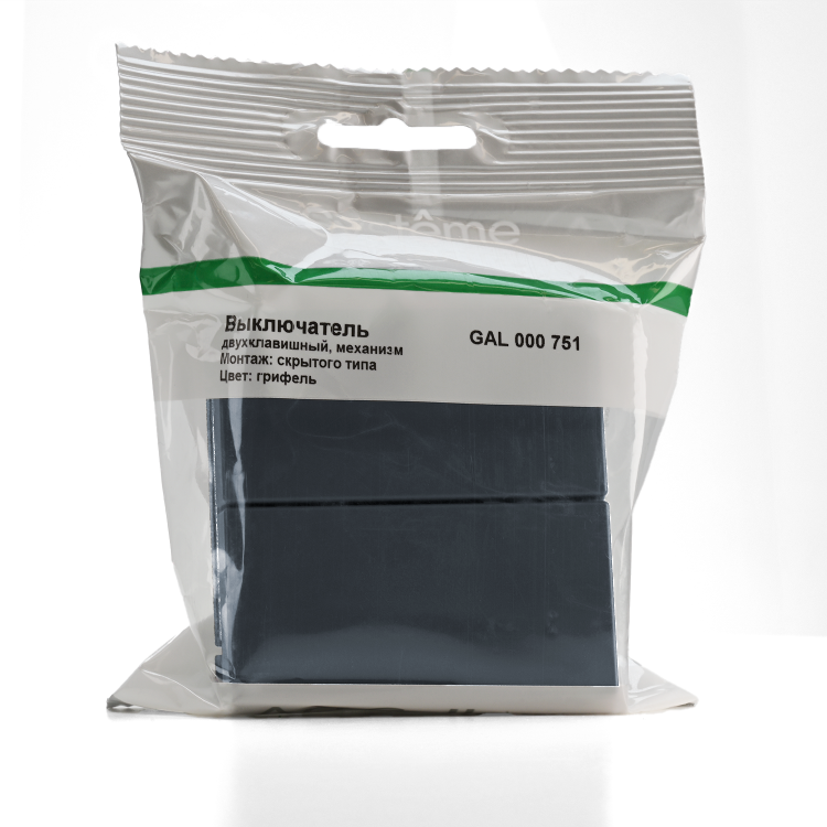 Механизм выключателя 2-клавишного Systeme Electric серии ArtGallery в цвете грифель подходит для сетей 250 В, на ток 10 А.