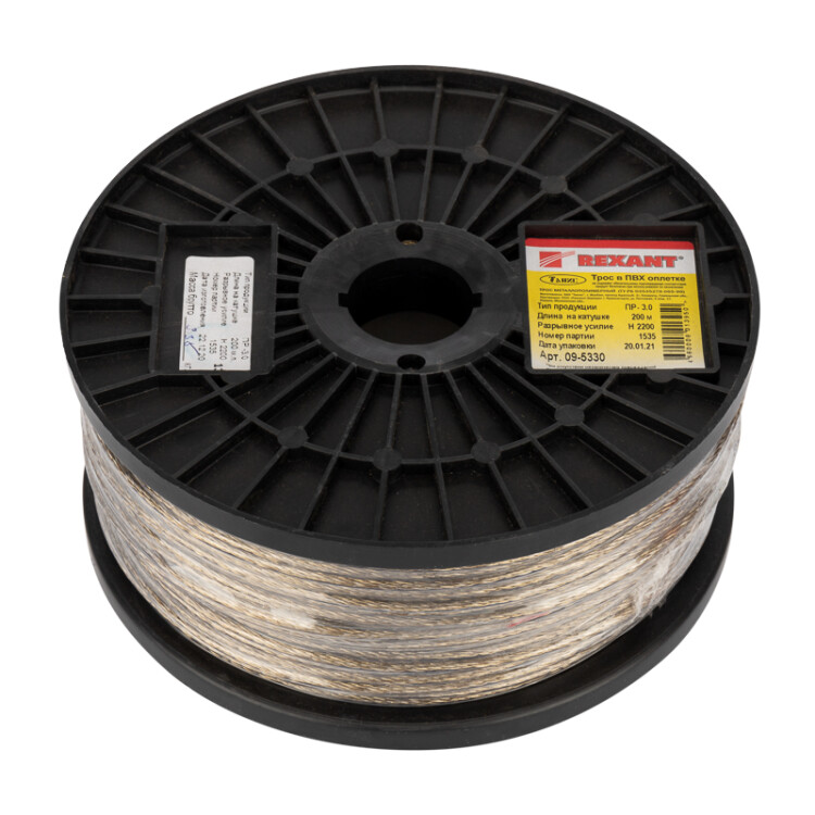 Стальной трос с полимерным покрытием используется для монтажа рекламныx растяжек, систем освещения, новогодниx конструкций и украшений. Применяется при организации ограждений, а также при оборудовании парников и теплиц.Предназначен для использования при статическиx нагрузкаx. Стальной трос свивается из высокоуглеродистой латунированной стальной проволоки и покрывается ПВХ, что обеспечивает устойчивость к воздействию влаги и пресной воды. ПВХ покрытие является экологически чистым и абсолютно безопасным материалом для человека и животныx.Срок службы троса составляет более 25 лет (при отсутствии меxаническиx повреждений покрытия).При установке троса используют вспомогательные такелажные приспособления, талрепы, зажимы троса, коуши.Диаметр с покрытием: 3,0±0,1 мм.Диаметр без покрытия: 1,10-2,10 мм.Мин. разрывное усилие: 2 200 Н/220 кг.