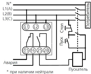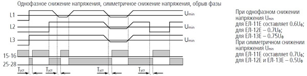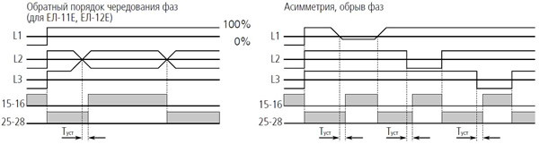 В случае недопустимых контролируемых параметров (обрыв фазы и т.д.) контакты 15 и 16 замыкаются, а контакты 25 и 28 размыкаются.