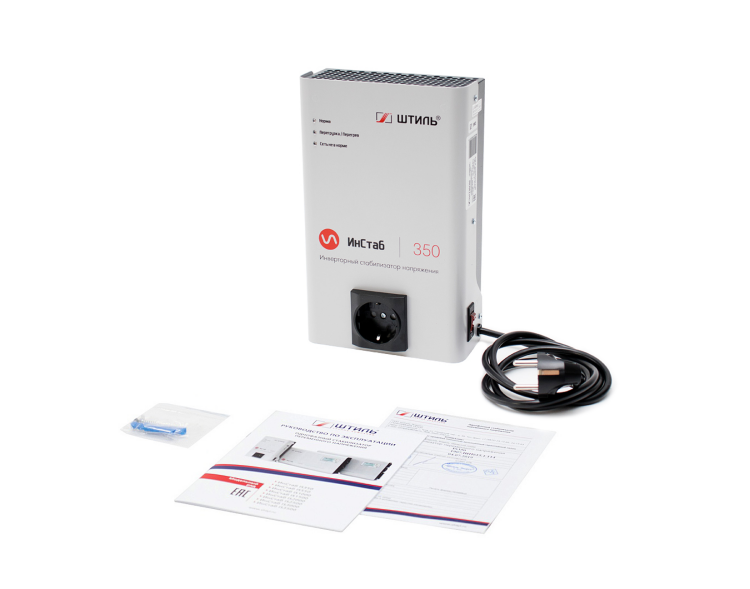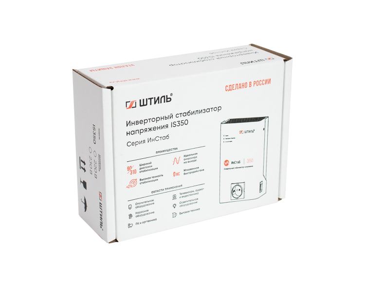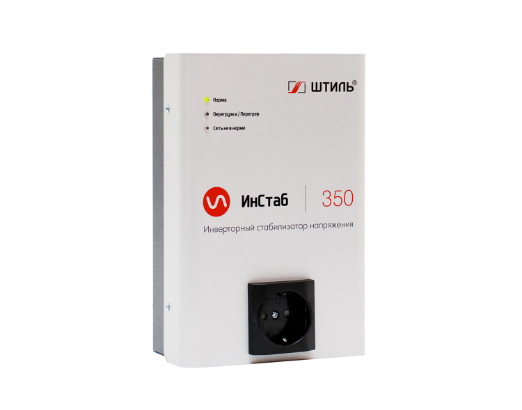 Инверторный стабилизатор напряжения Штиль IS350 устройство нового поколения, принцип работы которого основан на технологии двойного, бестрансформаторного преобразования энергии. Он предназначен для защиты от повышенного и пониженного входного напряжения однофазных электроприборов с потребляемой мощностью не более 350 ВА/300 Вт, например, газовых котлов, телевизоров, ПК и периферийного оборудования, аудио- и видеотехники. Стабилизатор выполнен в конструктиве для настенной установки. Он подключается к сети с помощью кабеля длиной 1,3 м с трёхполюсной вилкой. Для подключения нагрузки на передней панели предусмотрена EURO розетка с заземлением. Здесь же расположены четыре светодиодных индикатора, которые позволяют контролировать состояние и режим работы стабилизатора. В стабилизаторе реализован конвекционный безвентиляторный способ охлаждения, за счёт чего он работает практически бесшумно. Предусмотрена электронная аварийная защита от короткого замыкания, импульсных помех, перегрузки, перегрева и аварии сети.