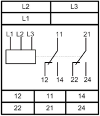 - При подаче на реле трехфазного напряжения осуществляется проверка всех контролируемых параметров и, если они в норме, реле включается (контакты 11-12, 21-22 размыкаются, контакты 11-14, 21-24 замыкаются).