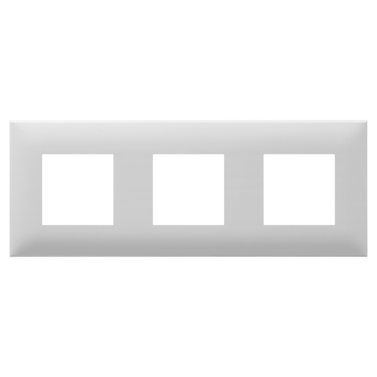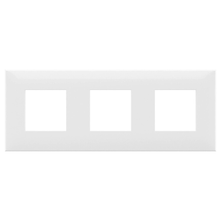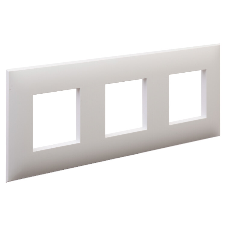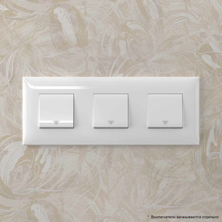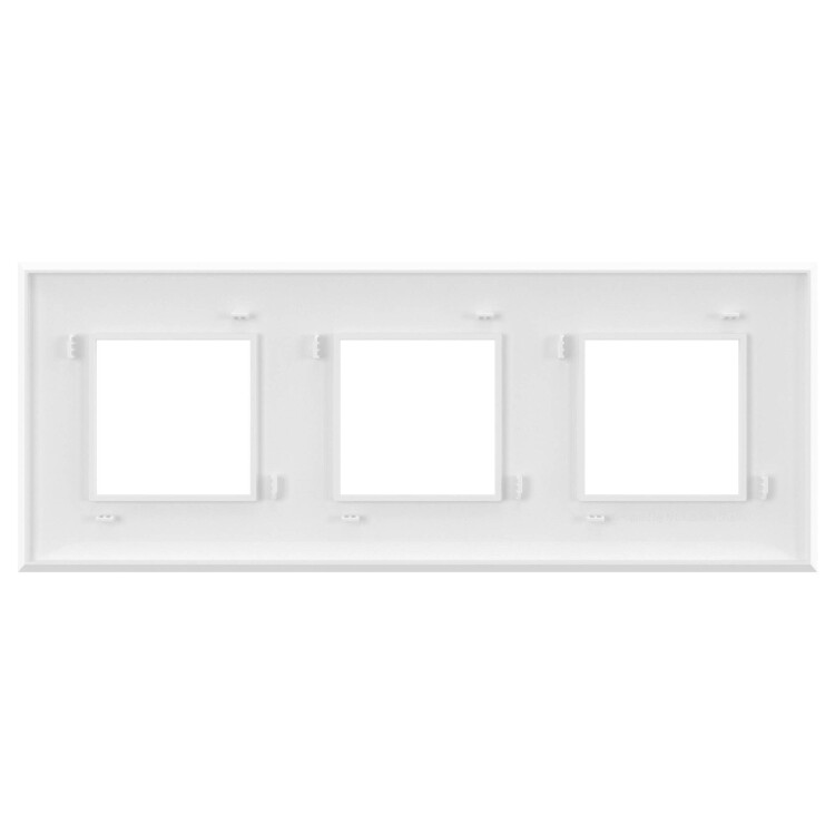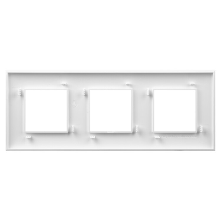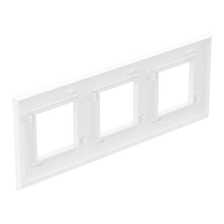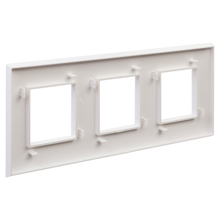 Рамка имеет 3 места под электроустановочные изделия (максимальная вместимость – 6 модулей), может размещаться как горизонтально, так и вертикально. Габаритные размеры: 235х90 мм. Материал – термопласт.