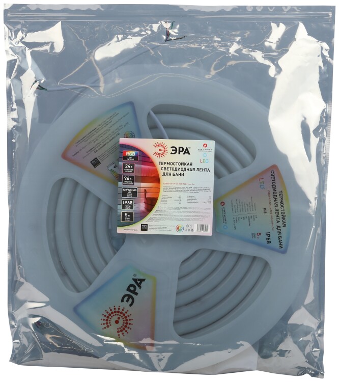 Термостойкая светодиодная лента LS3030-9,6-120-24-RGB-IP68-3 year-5m со степенью защиты от пыли и влаги IP68 - современный способ создания подсветки и освещения в банях и саунах. Светодиодная лента предназначена для эксплуатации при температурах от -30 С до + 100 С. Легко и быстро устанавливается на любой поверхности с помощью крепежей, которые есть в комплекте со светодиодной лентой. Светодиодная лента не требует пайки. Для подключения можно использовать коннектор Б0062347 - LS-connector-18mm-RGB-D-IP68-bath. Рабочее напряжение ленты составляет 24 В, а мощность равна 9,6 Вт/м. Светодиодная лента обладает дневным белым цветом свечения (620/520/465 Нм). Угол рассеивания 360. ВНИМАНИЕ: термостойкую светодиодную ленту с напряжением 24В допустимо подключать последовательно отрезками не более 5 м. Во избежание выхода из строя не допускается длительная работа ленты в смотанном виде.