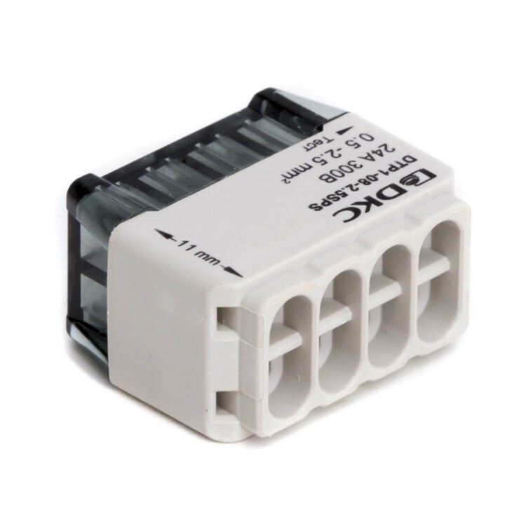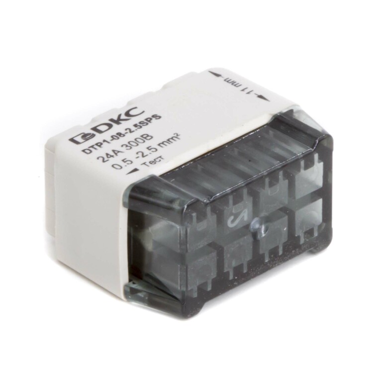 Безвинтовая клеммная колодка предназначена для соединения и ответвления 8-ми однопроволочных проводников сечением от 0,5 до 2,5 мм² без использования специального инструмента. Уникальный цвет корпуса: серый.