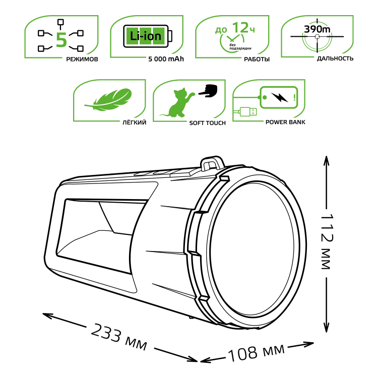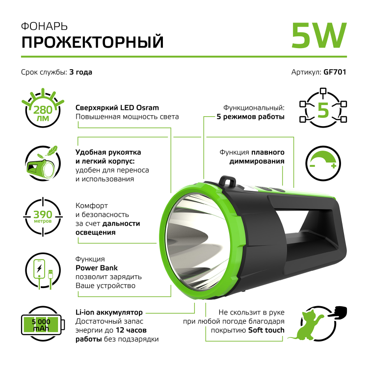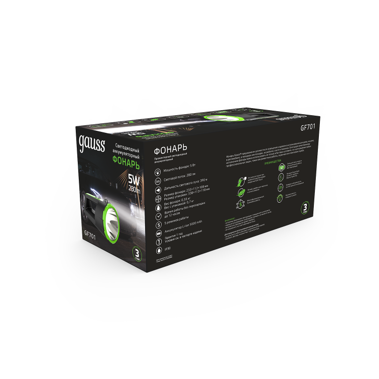 Фонарь прожекторный Gauss GFL701 имеет повышенные: яркость, водопроницаемость свечения и сроки работы благодаря светодиодам Osram. У фонаря имеется 5 режимов, дальность свечения 390м, мощный аккумулятор c функцией Power Bank и длительный, до 12ч, период работы без подзарядки. У фонаря так же имеется удобная функция плавного убавления света. Он легкий и удобный с антискользящим покрытием, может применяться в любых сферах жизнедеятельности человека при отсутствии стационарного источника освещения: дома, в автомобиле, на даче, в поездках и походах, а так же при выполнении профессиональных работ.