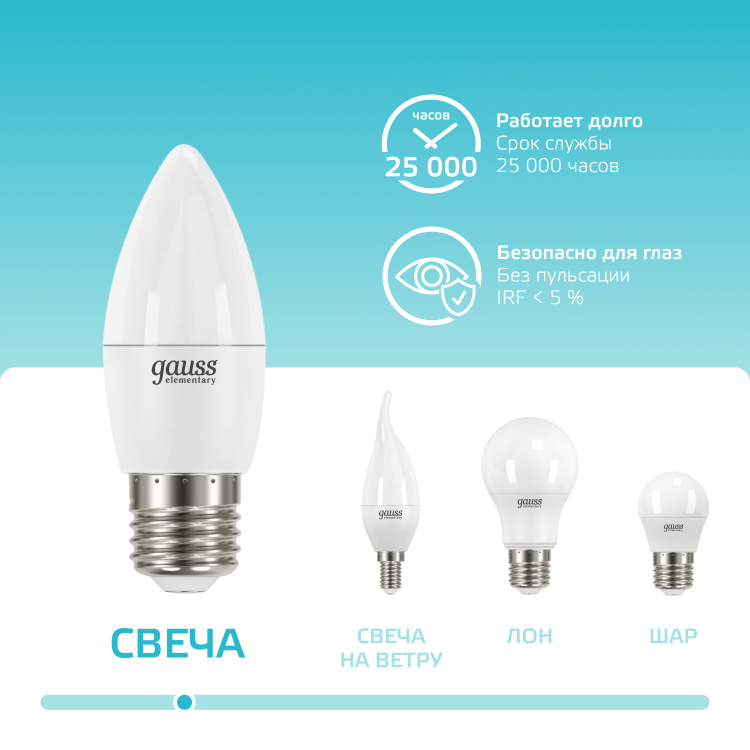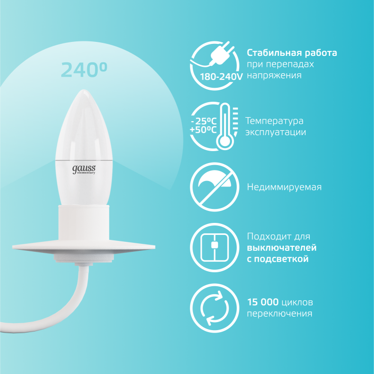 Светодиодные лампы Gauss Elementary Candle созданы в форме свечи. Лампы подойдут как для домашнего, так и для коммерческого использования. Такой тип освещения прекрасно смотрится в светильниках без плафонов или устанавливается в люстры и бра. Модель обладает широким диапазоном цветовых температур и мощностей, что поможет создать атмосферу тепла и уюта или концентрации. Равномерный спектр света создает зрительный комфорт в любом помещении. Данный тип освещения от Gauss обеспечивают стабильную работу в течение всего срока службы.
