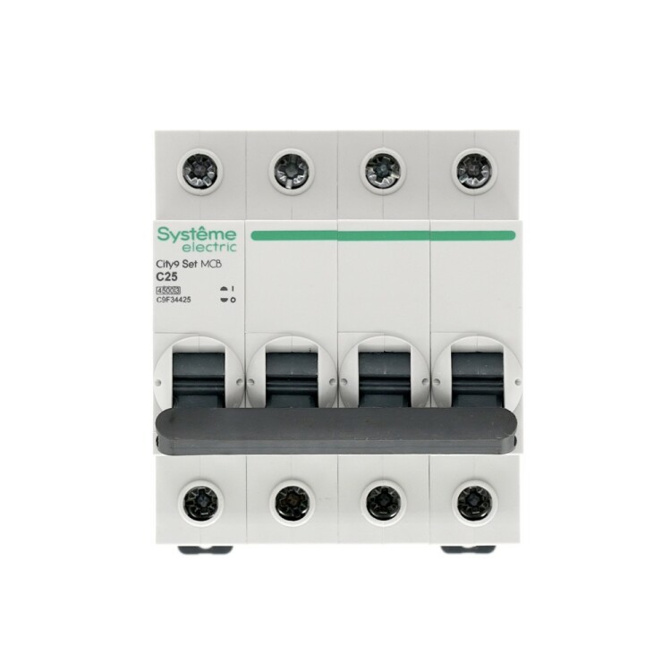 Автоматический выключатель серии City9 Set Systeme Electric, 4-полюсный, номинальный ток 25 А, характеристика С, Icn = 4.5 кА. Примен яется в электрических сетях напряжением 400 В. Предназначен для защиты от перегрузок и токов короткого замыкания. Оснащен механизмом «мгновенной коммутации». Ударопрочный корпус из специального пластика с 6 металлическими заклепками. Безопасные клеммы исключают попадание кабелей в заклеммное пространство (ранее Schneider Electric Easy9 EZ9F34425).