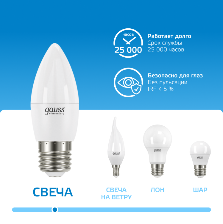 Светодиодные лампы Gauss Elementary Candle созданы в форме свечи. Лампы подойдут как для домашнего, так и для коммерческого использования. Такой тип освещения прекрасно смотрится в светильниках без плафонов или устанавливается в люстры и бра. Модель обладает широким диапазоном цветовых температур и мощностей, что поможет создать атмосферу тепла и уюта или концентрации. Равномерный спектр света создает зрительный комфорт в любом помещении. Данный тип освещения от Gauss обеспечивают стабильную работу в течение всего срока службы.