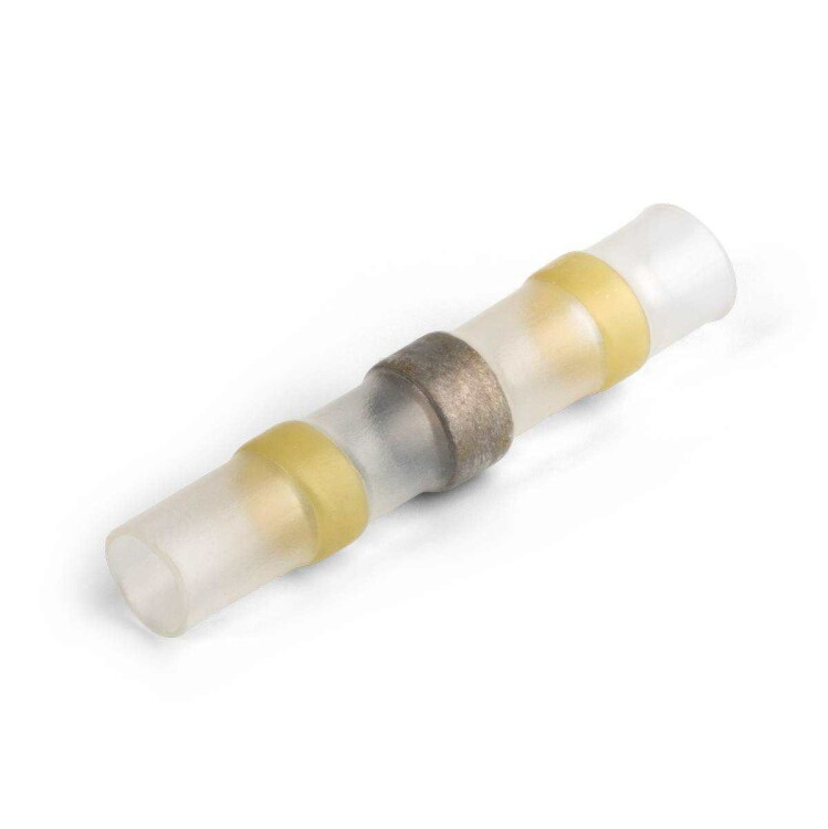 Предназначены для паяного соединения встык многопроволочных медных проводов. Не требуют использования канифоли для монтажа.Материал изоляции: сшитый полиэтилен. Не содержит галогенов.Термостойкость изоляции: 125 C.Максимальное напряжение: 690 В.Особенности конструкции: в центре соединителя расположено кольцо низкотемпературного припоя.по краям соединителя на внутренней поверхности термоусаживаемой трубки интегрированы цветные пояски термоплавкого клея, обеспечивающие полную герметичность соединения после усадки.Прозрачная изоляция обеспечивает визуальный контроль в процессе монтажа.Цвет поясков термоплавкого клея помогает идентифицировать размеры.Порядок монтажа: разместите соединитель на одном из проводов, сдвинув его в сторону от предварительно зачищенных концов жил.распушите отдельные проводники и соедините концы жил встык таким образом, чтобы концы проводников заходили друг в друга.обожмите руками выступающие проводники, сформировав место стыка.сдвиньте соединитель на место контакта таким образом, чтобы поясок припоя располагался по центру соединяемых зачищенных жил.используя бутановую горелку или высокотемпературный фен, равномерно прогрейте припой со всех сторон до его расплавления.дайте изделию остыть.Инструмент для монтажа: высокотемпературный фен .