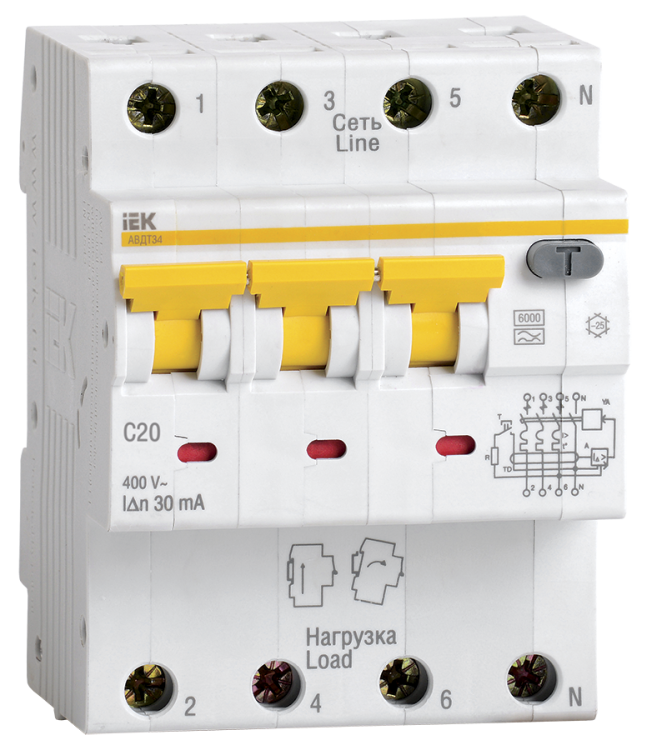 АВДТ34 выпускаются в четырехполюсном исполнении на номинальные токи 6, 10, 16, 20, 25, 32, 40, 50, 63 А и номинальные отключающие дифференциальные токи 10, 30, 100, 300 мА.