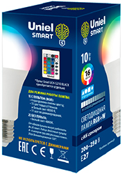 Лампа светодиодная Uniel LED-A60-10W-RGB-E27-REG PLS21WH Smart (А60 стандарт, 220 В, 10 Вт), с ИК сенсором, цвет свечения RGB+W