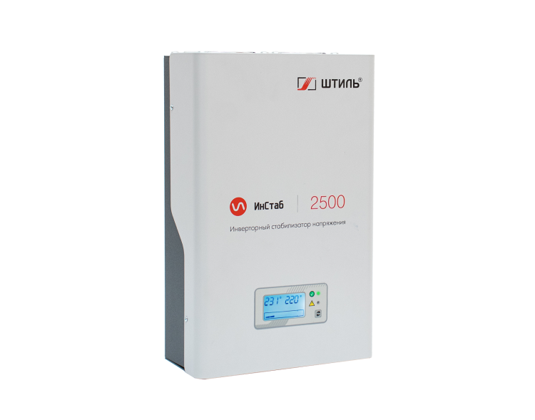 Инверторный стабилизатор напряжения Штиль IS2500 – устройство нового поколения, принцип работы которого основан на технологии двойного, бестрансформаторного преобразования энергии. Он предназначен для защиты от повышенного и пониженного входного напряжения однофазных электроприборов с потребляемой мощностью не более 2500 ВА/2000 Вт, например, газовых котлов, телевизоров, холодильников, микроволновых печей, электроинструментов. Стабилизатор выполнен в универсальном конструктиве для настенной или настольной установки. Он подключается к сети с помощью клеммной колодки и вводного автомата. Для подключения нагрузки на боковой панели предусмотрены две EURO розетки с заземлением и клеммы. На передней панели расположены ЖК-дисплей и два светодиодных индикатора, которые позволяют контролировать основные параметры входной и выходной сети, состояние и режим работы стабилизатора. Предусмотрена электронная аварийная защита от короткого замыкания, импульсных помех, перегрузки, перегрева и аварии сети.
