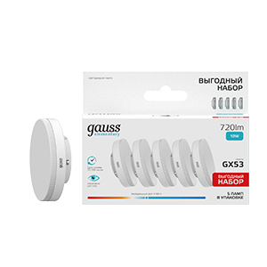 Лампа свд 220В GX53 10Вт 4100К 720лм таблетка матовая Gauss комплект 5шт