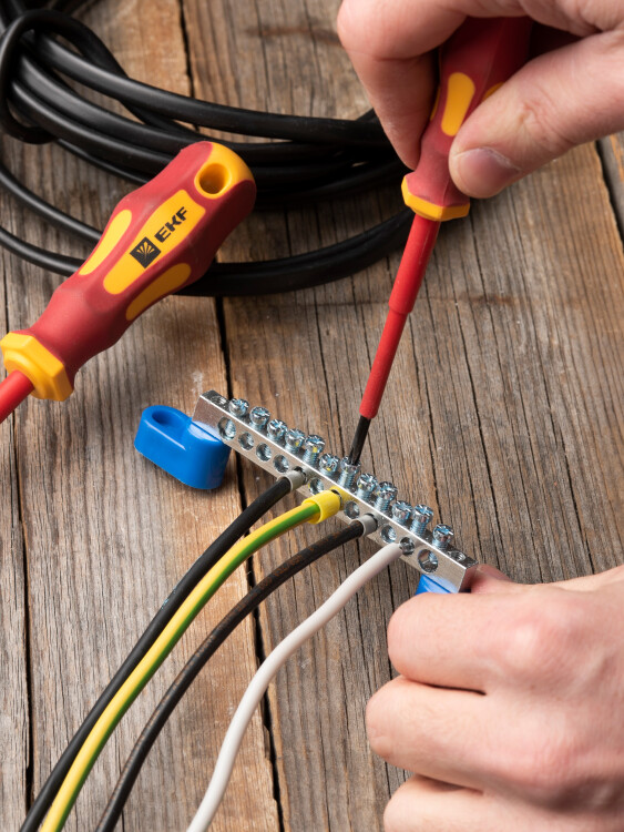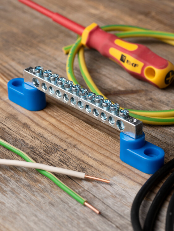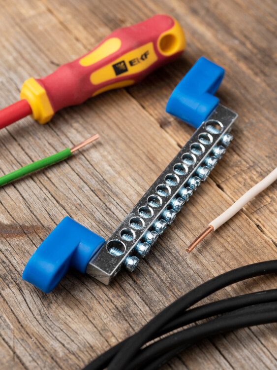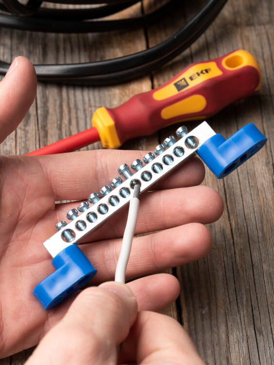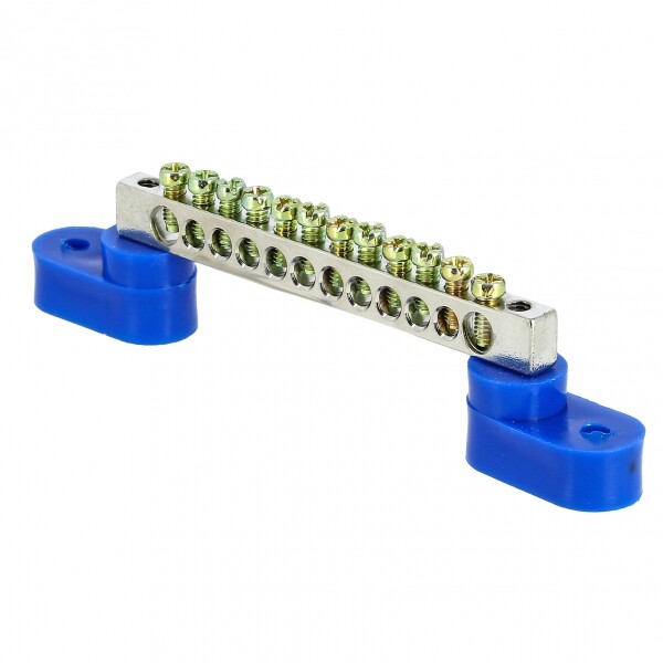 Шина нулевая 6*9 12групп 2 угловых изолятора синий винтовой по краям EKF