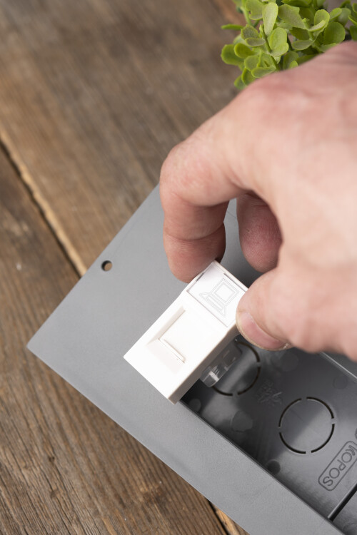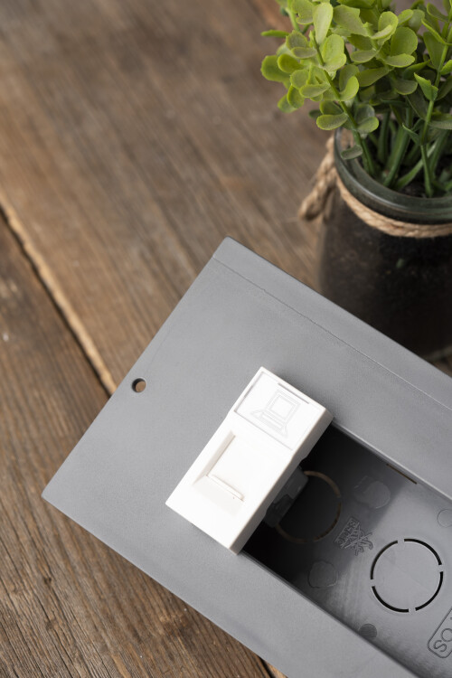 Модульные электроустановочные изделия для установки в напольные лючки C-Line и парапетный кабельный канал C-Line. Легкий монтаж методом защелкивания