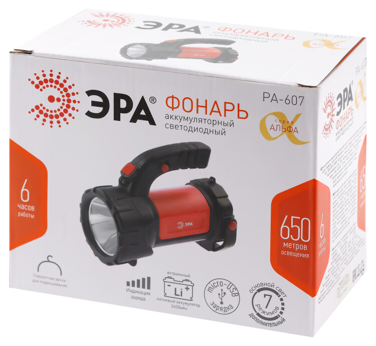 ЭРА Альфа PA-607 мощный аккумуляторный фонарь-прожектор, создающий 650 метров освещения. Яркий ровный свет за счет светодиодной технологии последнего поколения. Фонарь отличается приятным дизайном и комфортом в использовании.В комплекте microUSB-кабель для подзарядки, имеется индикатор уровня заряда. При полном заряде работает непрерывно 6 часов. Благодаря емкому литиевому аккумулятору (2400 мАч) фонарь долго светит и мало весит. Удобно брать с собой, переносить, подвешивать и устанавливать на поверхность в качестве светильника. Идеальный вариант для кемпинга.Многофункциональность ЭРА PA-607 обеспечивается 7 режимами работы: разные уровни яркости, мигание, дальний свет, светильник, дальний свет + светильник. Эргономичная ручка и поворотный подвес.