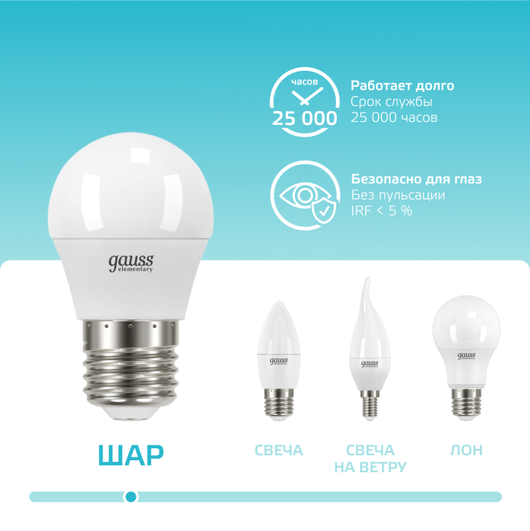 Светодиодные лампы Gauss Elementary – вечная классика, которая является энергосберегающей заменой обычным лампам накаливания. Модели представленные в ассортименте бренда обеспечивают пространство мягким не мерцающим светом и обладают всеми техническими характеристиками европейского уровня. В линейке представлены модели разных форм, высоких мощностей и размеров. Равномерное распределение света создает зрительный комфорт в любом помещении. Данная серия ламп создана для массового потребителя и имеет самое лучшее соотношение цена-качество.
