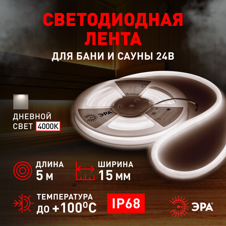 Термостойкая светодиодная лента LS2835-9,6-120-24-4000K-IP68-3 year-5m со степенью защиты от пыли и влаги IP68 – современный способ создания подсветки и освещения в банях и саунах. Светодиодная лента предназначена для эксплуатации при температурах от -30 С до + 100 С. Легко и быстро устанавливается на любой поверхности с помощью крепежей, которые есть в комплекте со светодиодной лентой. Светодиодная лента не требует пайки. Для подключения можно использовать коннектор Б0062253 - LS-connector-15mm-D-IP68-bath. Рабочее напряжение ленты составляет 24 В, а мощность равна 9,6 Вт/м. Светодиодная лента обладает световым потоком 900 лм/м с дневным белым цветом свечения (4000 К). Угол рассеивания 360.ВНИМАНИЕ: термостойкую светодиодную ленту с напряжением 24В допустимо подключать последовательно отрезками не более 5 м. Во избежание выхода из строя не допускается длительная работа ленты в смотанном виде.