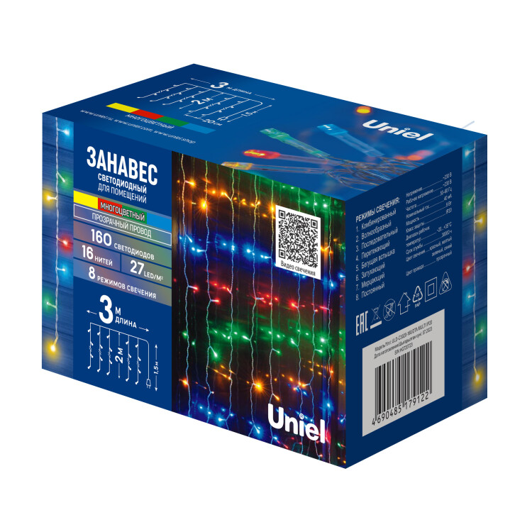 ULD-C3020-160/DTA MULTI IP20 Занавес светодиодный, 3х2м. 160 светодиодов. Разноцветный свет. Провод прозрачный. TM Uniel