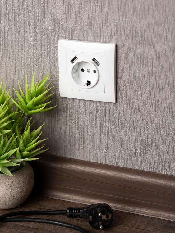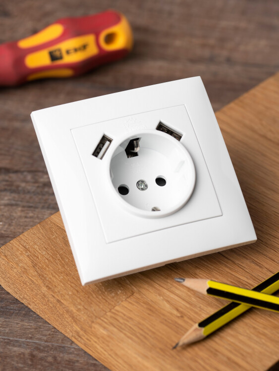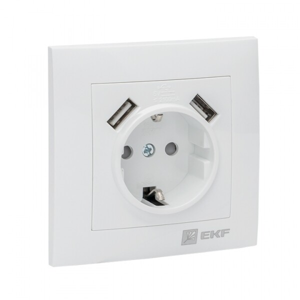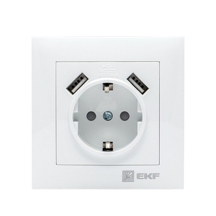 Розетка одноместная EKF EWR16-028-10-2USB "Валенсия" (16 А, IP20, 2 порта USB 2,1 А) скрытой установки, с заземлением и защитными шторками, белый