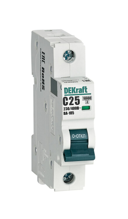 Автоматический выключатель серии ВА-105 DEKraft; 1P; ном. ток 25 А; характеристика C; откл. способность 10 кА; ширина модуля 18 мм. Аппараты имеют механизм мгновенной коммутации, 6 монолитных заклепок, которые повышают прочность корпуса. Боковые каналы охлаждения повышают стабильность работы при высоких температурах окружающей среды. Есть возможность установки дополнительных аксессуаров с левой стороны устройства. Аппарат на 100% совместим с корпусами и оболочками DEKraft и Systeme Electric.