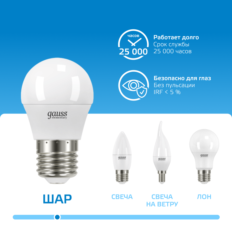 Светодиодные лампы Gauss Elementary – вечная классика, которая является энергосберегающей заменой обычным лампам накаливания. Модели представленные в ассортименте бренда обеспечивают пространство мягким не мерцающим светом и обладают всеми техническими характеристиками европейского уровня. В линейке представлены модели разных форм, высоких мощностей и размеров. Равномерное распределение света создает зрительный комфорт в любом помещении. Данная серия ламп создана для массового потребителя и имеет самое лучшее соотношение цена-качество.