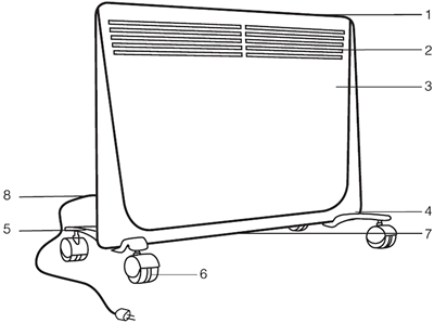 1 - блок управления. 3 - конвекционная камера. 5 - ножки. 7 - воздухозаборная решетка. |
