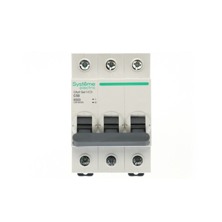 Автоматический выключатель серии City9 Set Systeme Electric, 3-полюсный, номинальный ток 50 А, характеристика С, Icn = 6 кА. Применя ется в электрических сетях напряжением 400 В. Предназначен для защиты от перегрузок и токов короткого замыкания. Оснащен механизмом «мгновенной коммутации». Ударопрочный корпус из специального пластика с 6 металлическими заклепками. Безопасные клеммы исключают попадание кабелей в заклеммное пространство (ранее Schneider Electric A9K24350, R9F12350).