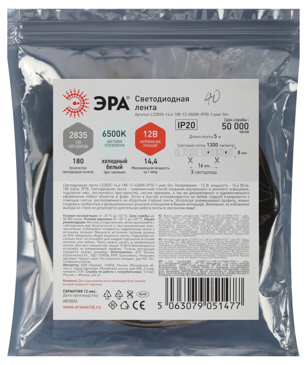 Светодиодная лента ЭРА LS2835 -14,4-180-12-6500K-IP20-1 year-5m холодный белый 5м со степенью защиты от пыли и влаги IP20 - современный способ создания внутреннего освещения, подсветки ниш, лестничного пространства, систем хранения, а также декоративного и художественного оформления любых объектов и форм в помещениях. Легко и быстро устанавливается на любой гладкой поверхности с помощью скотча, расположенного на оборотной стороне ленты. Используя алюминиевый профиль, можно создавать необычные и функциональные решения освещения в Вашем интерьере. Рабочее напряжение ленты составляет 12В, а мощность равна 14,4 Вт/м. Светодиодная лента обладает световым потоком 1300 Лм/м, и цветом свечения - холодный белый (6500 K)