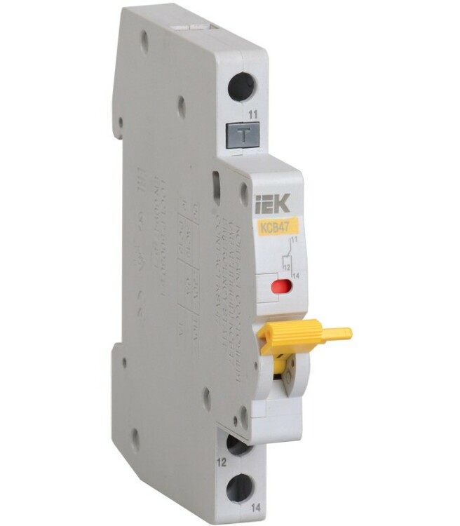 Контакт состояния КС47 и контакт состояния (аварийный) КСВ47 служат для получения информации о состоянии автоматических выключателей ВА47-29 и ВА47-100 в системах автоматизации технологических процессов или защиты конкретных объектов. КС47 выполняет функцию контакта состояния автоматического выключателя: включен – выключен. Переключение контактов КС47 происходит, даже если рукоятка управления выключателя удерживается во взведенном положении. КСВ47 выполняет функцию сигнализации положения механизма взвода ВА47. После установки модуля в зацепление с механизмом ВА47 при первом взведении рукоятки управления происходит переключение контактов, остающихся в таком положении и при ручном отключении ВА47. Переключение контактов произойдет только при срабатывании выключателя от сверхтоков (перегрузки или короткого замыкания). В верхней части модуля предусмотрена площадка, при нажатии на которую происходит принудительный сброс механизма и переключение контактов.