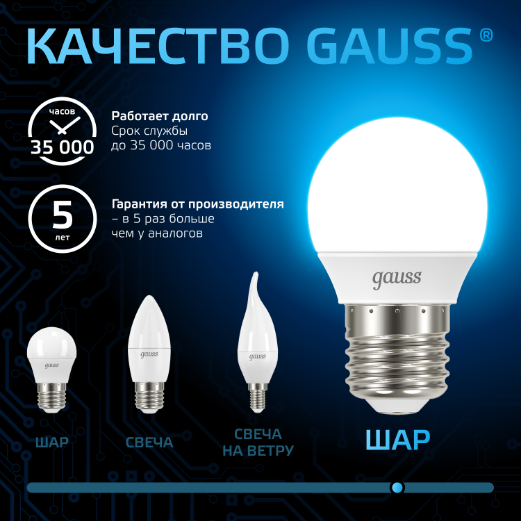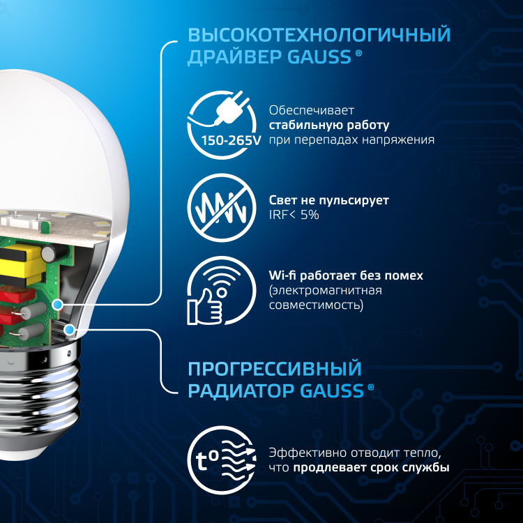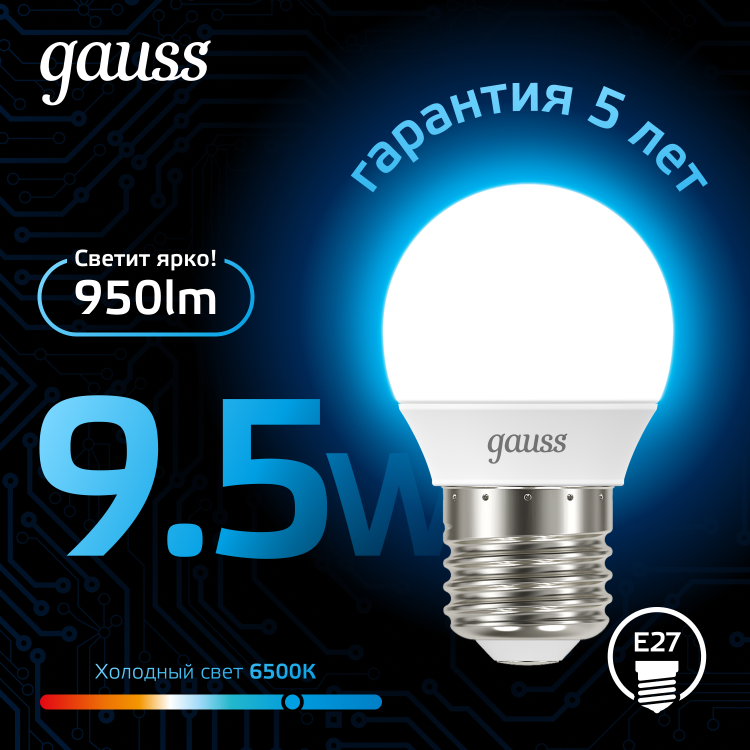 Светодиодные лампы Gauss Black в форме шара подойдут для большинства светильников, так как в категории присутствуют два вида цоколя. Светодиодные лампы Gauss Black активно используются для освещения жилых и офисных помещений. Лампы излучают приятный свет, который комфортен для глаз, без эффекта пульсации. Матовая колба ламп равномерно рассеивает свет и подходит для открытых светильников и прозрачных плафонов. Все лампы Gauss при колебаниях напряжения лампы не теряют яркость и не мерцают.