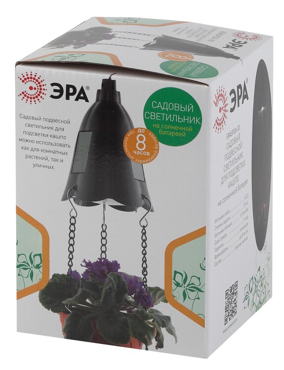 ЭРА ERASF024-30 (арт. Б0044237) - светодиодный садовый светильник с металлическими подвесами для размещения и подвески кашпо. Цветы будут красиво освещены даже в тёмное время суток. Идеальное решение для оформления беседок и веранд. Светильнику под кашпо не нужно подключение к электросети - он работает от встроенных в корпус солнечных панелей. Лёгкая высокопрочная конструкция обеспечивает долговечность и практичность данного садового светильника. Общая высота светильника с подвесами - 16 см. 3 светодиодных лампочки автоматически включаются вечером. Светодиодные батареи накапливают энергию солнца даже в пасмурную погоду.