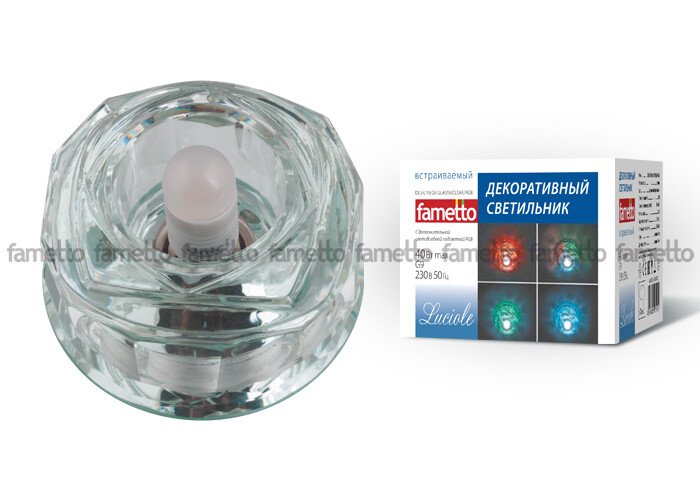 Входная частота, Гц - 50; Входное напряжение, В - 230; Диаметр выреза для монтажа, мм - 70; Диапазон рабочих температур, °С - -20 до +45; Класс защиты, IP - 20; Максимальная мощность, Вт - 35; Материал корпуса - стекло; Мощность дополнительной светодиодной подсветки, Вт - 1; Патрон - G9; Применяемая лампа - светодиод/ галоген; Рабочее напряжение дополнительной светодиодной подсветки, В - 85-265; Рабочее напряжение, В - 12/220; Размер видимой части светильника, мм - 85х50; Размеры, мм - 85х68; Свет - RGB; Способ установки - Встраиваемый; Срок гарантии - 24 месяца; Срок годности - не ограничен; Цвет базы - зеркальный; Цвет корпуса - прозрачный; Цоколь - G9
