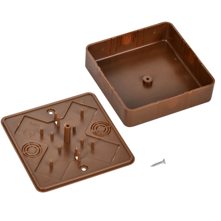 Монтажные коробки для открытого монтажа предназначены для разветвления проводов и кабелей, также для скрытия и дополнительной защиты мест коммутации. Коробки используются как часть системы электрической канализации, состоящей из кабельных каналов. Крепление к стене осуществляется при помощи саморезов. Материал изготовления: полистирол. Материал коробок является безгалогенным («HF» — halogen-free). Цвет: дуб. Степень защиты: IP40. Количество вводов: 2 - D=20мм. Размер: 100х100х29мм.