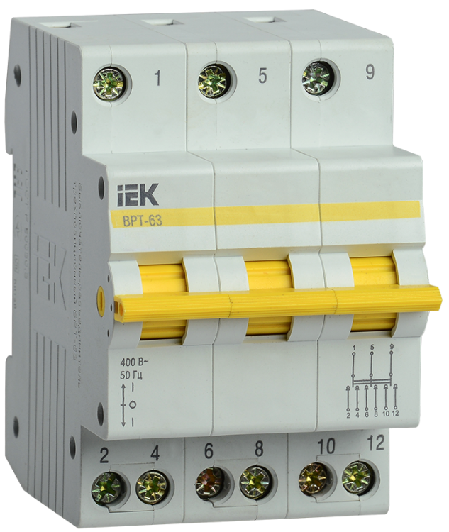 Выключатель-разъединитель трехпозиционный ВРТ-63 предназначен для коммутации смешанных активных и индуктивных нагрузок в цепях переменного тока напряжением до 400 В частотой 50 Гц. Применяется в качестве учетно-распределительного оборудования жилых и общественных зданий и сооружений, где предусматривается необходимость в оперативном отключении от сети отдельных групп электропотребителей или участков электрокоммуникации.