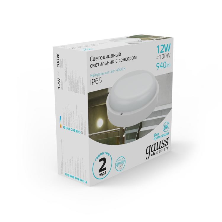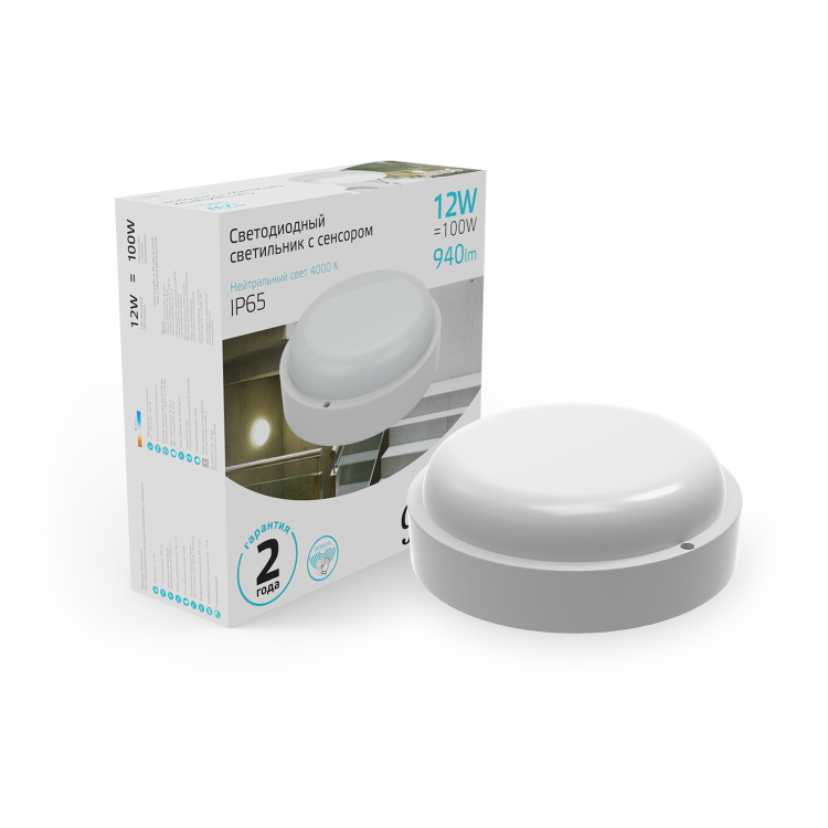 Светильник ДПП 12Вт 4000К 940лм круг белый датчик оптико-микроволновый IP65 Elementary Gauss