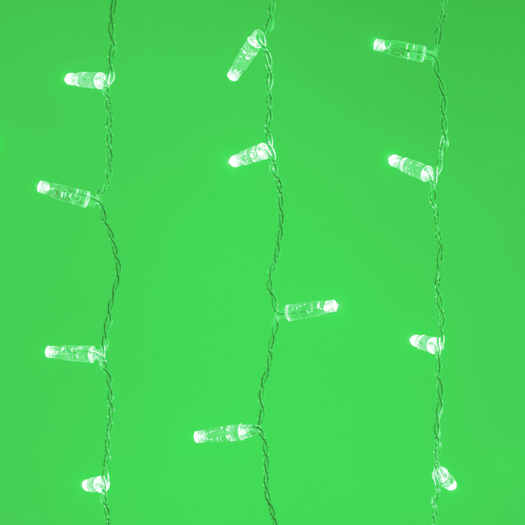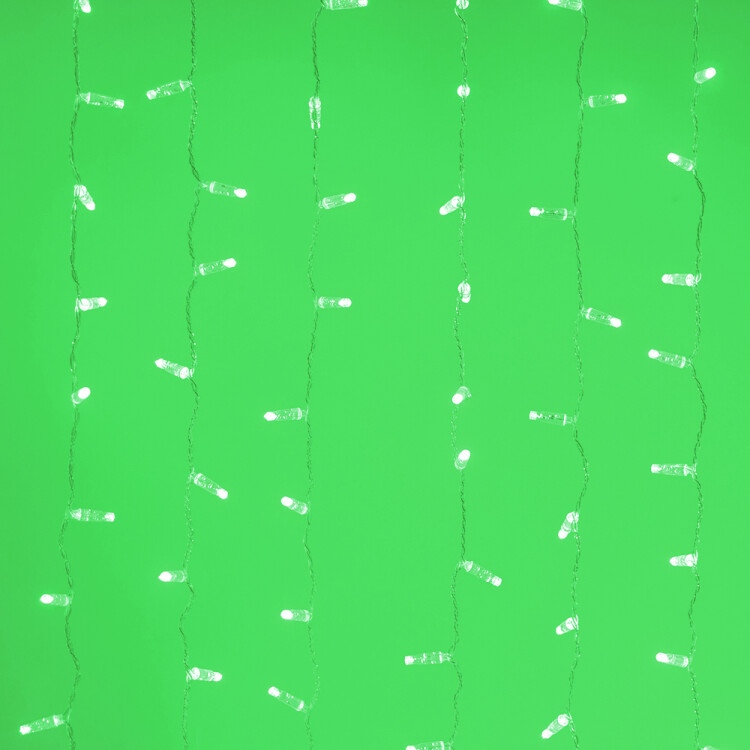 Светодиодный Занавес Classic. Размер 2000x3000 мм (длина 2000 мм, высота 3000 мм). 20 ниспадающих нитей длиной 3000 мм. 760 светодиодов размером 7 мм. Цвет свечения ЗЕЛЕНЫЙ, постоянное свечение и 8 динамических эффектов с резким световым рисунком (прозрачная вогнутая линза). Провод прозрачный, ПВХ. Питание 230 В, Мощность 60 Вт, защита IP65, применение в помещении и на улице под навесом. Аксессуар для подключения и выбора режима свечения в комплекте.