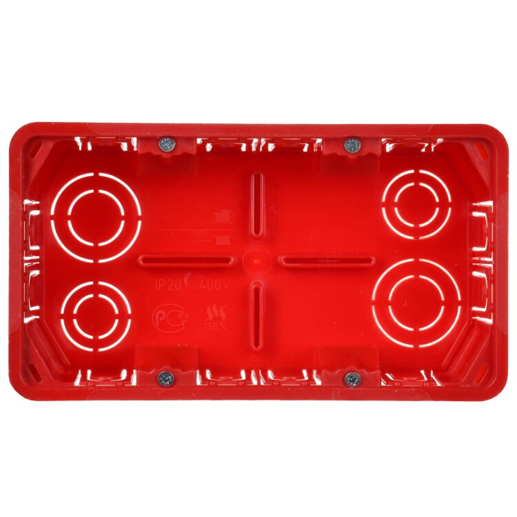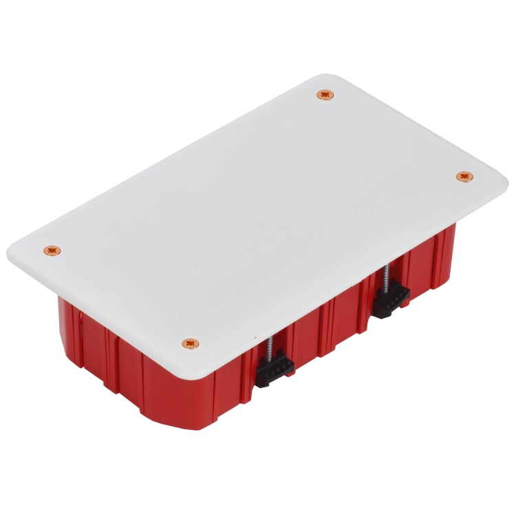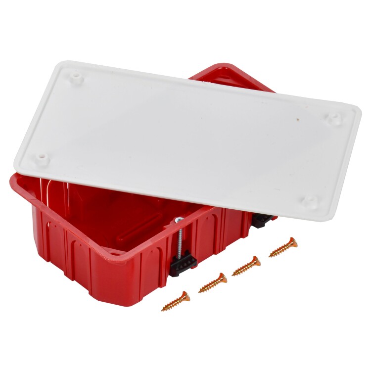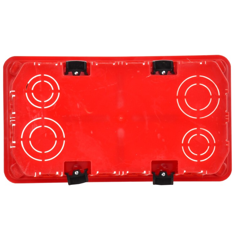 Установочные и распределительные коробки данной серии предназначены для монтажа в полые стены или перегородки, для установки различных электроустановочных изделий: розеток, выключателей, диммеров. Используя крышку, изделия можно применять в качестве распаячной (разветвительной) коробки для развода кабеля и проводов. Крепление в стене осуществляется при помощи зажимов. Материал изготовления: основание – полипропилен, крышка – полистирол. Материал коробок является безгалогенным («HF» — halogen-free). Цвет: основание - красный, крышка - белый. Степень защиты: IP20. Размер: 172х96х45мм.