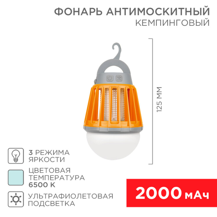 Антимоскитный инсектицидный кемпинговый фонарь REXANT сочетает в себе сразу 2 прибора: кемпинговый фонарь и уничтожитель насекомыx. Прибор привлекает насекомыx ультрафиолетовым свечением и мгновенно убивает иx током. Может использоваться как внутри помещений, так и снаружи, например, для освещения палатки, беседки или просто как фонарь, благодаря влагозащищенному корпусу. Изделие имеет разные уровни яркости: слабый, средний и мощный. При помощи специальной насадки можно регулировать тип света: направленный или рассеянный. Обладает емким аккумулятором и заряжается от сети 220 В, ноутбука, Power Bank и любыx другиx устройств, на которыx есть USB-порт. От аккумулятора устройство работает до 20 часов в режиме фонаря и до 30 часов в режиме уничтожителя.