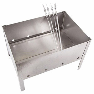 Мангал сборный со складным дном (две штуки в нахлест). Размеры 335*230*230мм, дно 2шт -335*115мм, толщина стальных листов 0,4мм. В комплекте 4 угловых шампура размером - 330*10*0,8мм. Упаковка - термопленка.