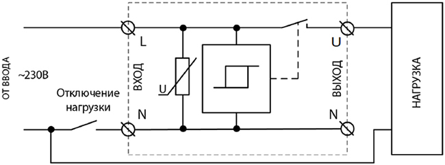 Устройство представляет собой реле контроля напряжения с мощным электромагнитным реле на выходе, дополненное варисторной защитой.
