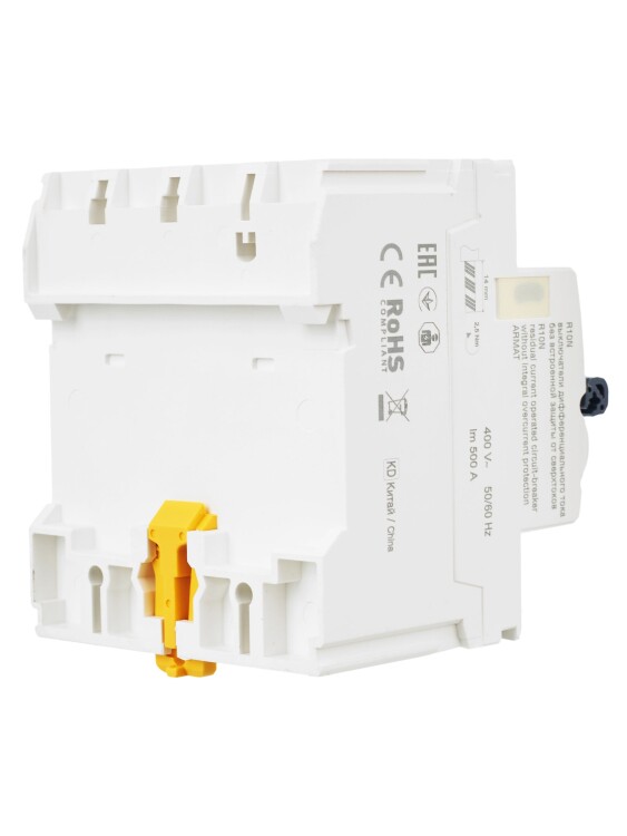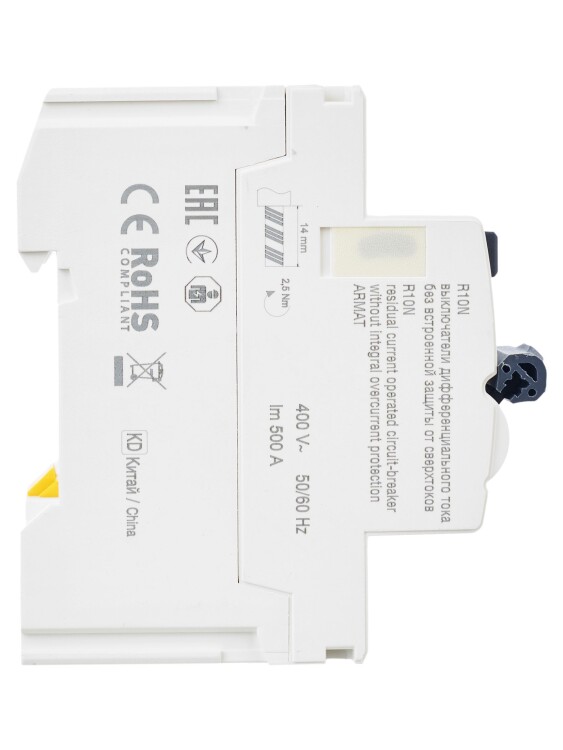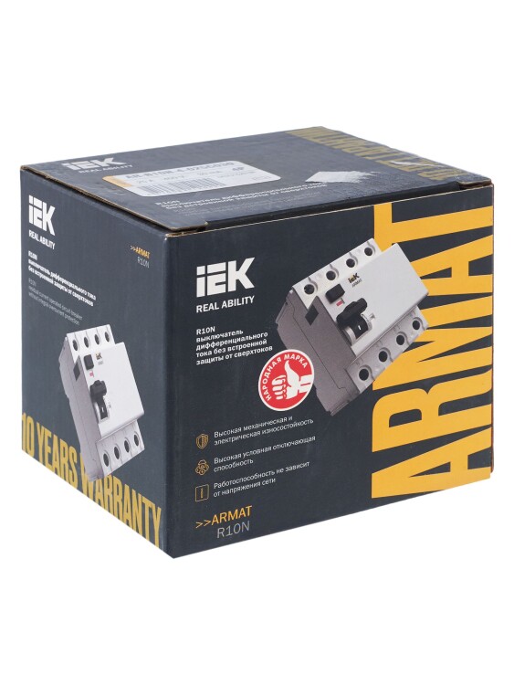 Выключатели дифференциального тока ARMAT серии R10N выполняют функцию защиты поражения человека электрическим током, а так же защиты от пожара при возникновении замыкания на землю. Модельный ряд включает в себя устройства с типами защитных характеристик по дифференциальному току AC, A, AC-S, A-S; номинальными токами от 25 до 100 А; номинальными дифференциальными токами срабатывания от 10 до 300мА. Условная отключающая способность ВДТ ARMAT серии R10N составляет 10 кА.