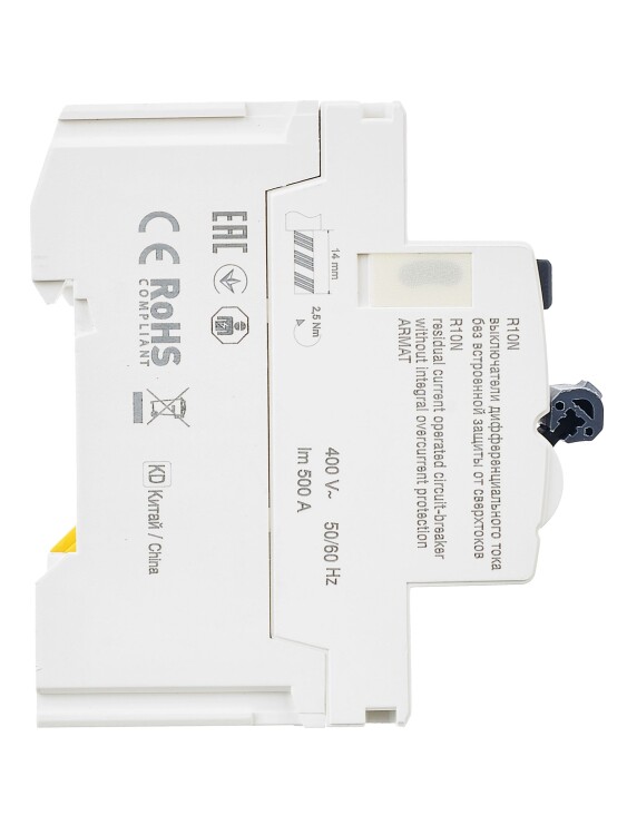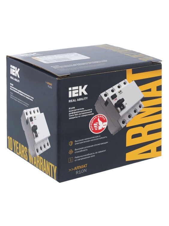 Выключатели дифференциального тока ARMAT серии R10N выполняют функцию защиты поражения человека электрическим током, а так же защиты от пожара при возникновении замыкания на землю. Модельный ряд включает в себя устройства с типами защитных характеристик по дифференциальному току AC, A, AC-S, A-S; номинальными токами от 25 до 100 А; номинальными дифференциальными токами срабатывания от 10 до 300мА. Условная отключающая способность ВДТ ARMAT серии R10N составляет 10 кА.