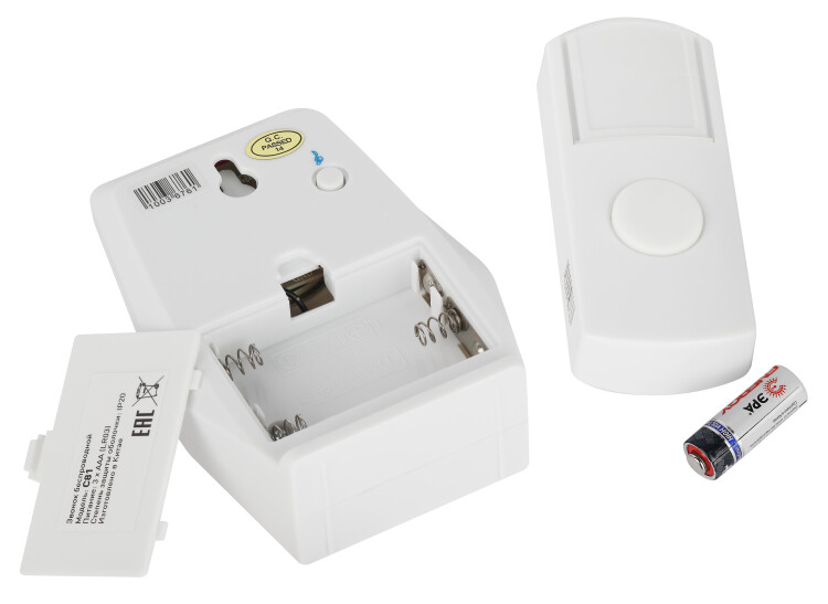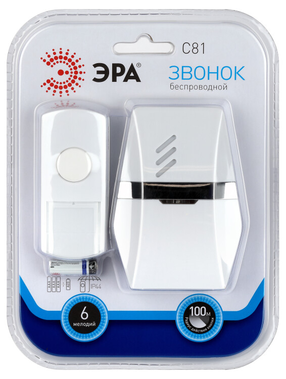 Беспроводной электрический дверной звонок с 6 качественными мелодиями, световым сигналом и влагозащищённой кнопкой. Прост в подключении. Отсутствие проводов позволяет использовать звонок с максимальным удобством. Динамик можно разместить в коридоре или взять с собой в комнату/на кухню если не хотите разбудить домочадцев. Беспроводные звонки ЭРА хороши для дачи или загородного дома установите кнопку на дверной калитке, а динамик в помещении. Радиус действия - до 100 метров. Звонок работает от батареек: 1 шт А23 для кнопки (входит в комплект), 2 шт АА пальчиковые для динамика (в комплект не входят). При среднем использовании (до 20 звонков в день) исправно проработает без замены элементов питания не менее года. Аккуратный внешний вид и приятная упаковка - отличный подарок на новоселье и другие праздники.