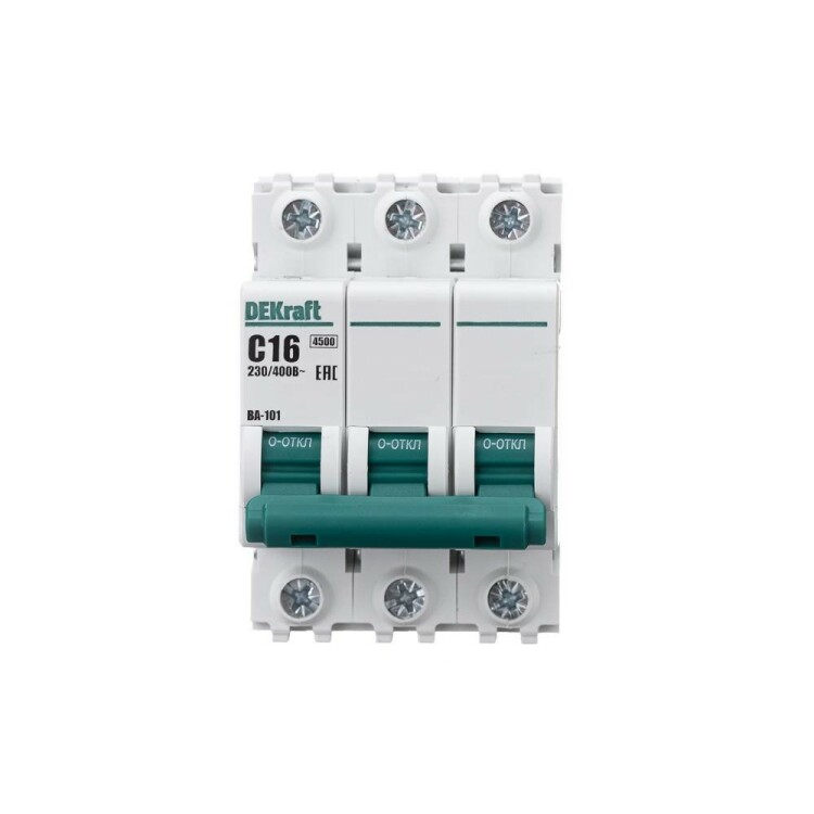Автоматический выключатель серии ВА-101 Dekraft; 3P; номинальный ток 16 А; характеристика С; отключающая способность 4,5 кА. 5 монолитных заклепок повышают прочность корпуса аппарата. Сплошная лицевая панель обеспечивает безопасность эксплуатации аппарата. Боковые каналы охлаждения повышают стабильность работы при высоких температурах окружающей среды. Есть возможность установки доп олнительных аксессуаров с левой стороны устройства. Аппарат на 100% совместим с корпусами Dekraft и Systeme Electric.
