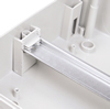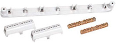 Съемный держатель шин N и PE можно устанавливать как вверху, так и внизу корпуса на специальные крепления. Сами же шины N и PE устанавливаются на съемный держатель простым защелкиванием в посадочные места. |