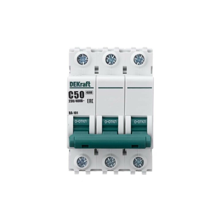 Автоматический выключатель серии ВА-101 Dekraft; 3P; номинальный ток 50 А; характеристика С; отключающая способность 4,5 кА. 5 монолитных заклепок повышают прочность корпуса аппарата. Сплошная лицевая панель обеспечивает безопасность эксплуатации аппарата. Боковые каналы охлаждения повышают стабильность работы при высоких температурах окружающей среды. Есть возможность установки доп олнительных аксессуаров с левой стороны устройства. Аппарат на 100% совместим с корпусами Dekraft и Systeme Electric.