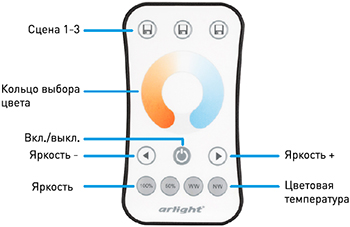 Радиопульт Arlight Smart-R37-MIX с кнопками и сенсорным кольцом предназначен для дистанционного управления мультибелыми MIX светодиодными источниками света.