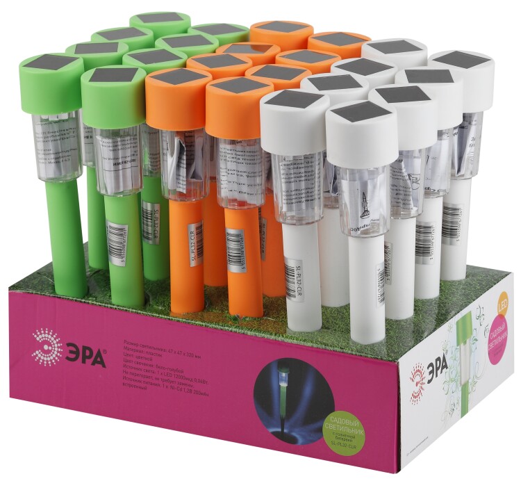 ЭРА SL-PL30-CLR (арт. Б0032593) - бюджетная модель садового светильника классической формы. Этот светильник уличный надёжно защищён от влаги и пыли - IP54. Выполнен из прочного пластика. Светильник садовый устанавливается прямо в грунт и помогает быстро и просто создать красивый ландшафтный дизайн на загородном участке. Нейтральное белое свечение активируется автоматически, как только наступают сумерки. Солнечная панель расположена на верхушке светильника и отлично накапливает энергию. Высота светодиодного светильника для сада на солнечной батарее - 32 см. В промоупаковке 24 светильника в трёх цветах: насыщенный зелёный, оранжевый, белый. Цвета подобраны так, чтобы LED-светильник был хорошо заметен днём в земле, на траве или на садовой дорожке.