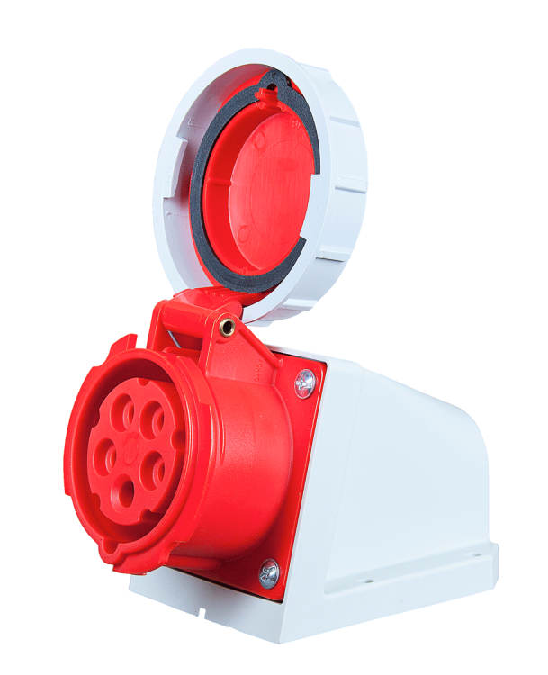 IP67 розетка наружной установки(ввод кабеля сверху, Pg21) . Цвет корпуса красный. 400V 50/60Гц. 5 контактов. Сила тока 16А.
